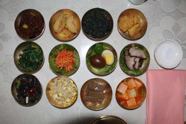 Bottom row (Left to Right): Cold mushroom salad, soy bean shoots, acorn jelly, cabbage kimchi