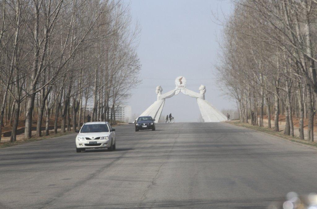 The two Korean women symbolizing the two sides unite holding the “Charter for Reunification” over the middle of the nicest highway in Korea: the one leading from Pyongyang south to the DMZ.