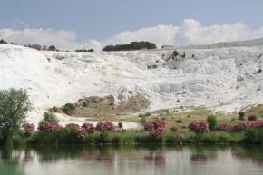At Pamukkale and Hierapolis. The white calcium carbonate deposited by the hot spring water as it loses its carbon dioxide, makes for brilliant white travertine terraces.