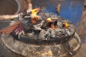 Incense burns alongside marigolds and terra cotta or brass cups. A mishmash of traditions which seem to work well here in Nepal.