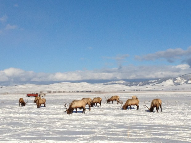 Two horses and a sleigh bring me here to the Elk refuge. Around Jackson there’s more than 17,000 elks gathered in the Hole, the flat area made up by sediments left by the glaciers a long time ago. We are at 6,300 feet, not so high really, but it gets so cold that the government created a Refuge for the elks, to provide them with enough grass and lichen to last through the the thick of the winter. The Refuge opens up to them on December 15th. Before that, they’re on their own for food. Once the Refuge opens, the elks stay in the area until the March thaw.