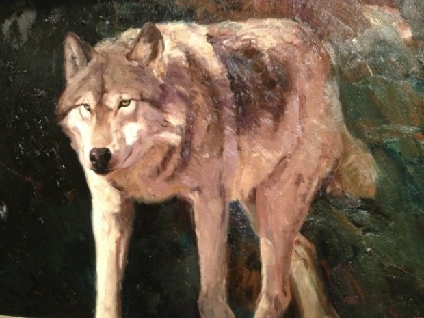 Carl painted this wolf. I find this painting very expressive and evocative. When I was growing up, wolves were often mentioned as the most fearsome animal around, and although no one has seen any in Burgundy for probably centuries, they are still part of folk lore and children are told to watch out for them.