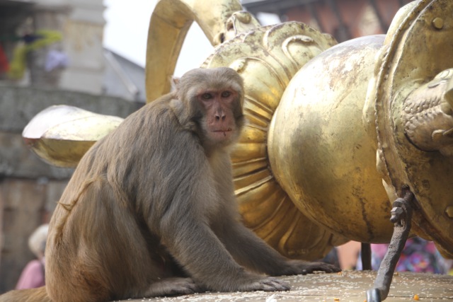 This monkey is having a grand time eating pellets of dried rice next to a large vajra.Although I find monkeys cute (my Western upbringing), they are widely considered a pest on the Indian subcontinent are tolerated here at