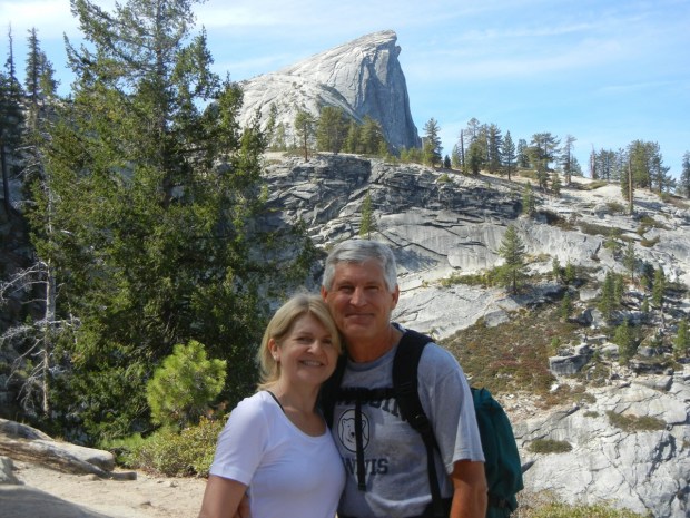 This year Ann and Steve are joining us. They take this picture as we have already done about 5 miles uphill, past Vernal Fall and Nevada Fall, through "little" Yosemite Valley, and up on the trail which takes us here, not so far any more from the base of the Dome. We are now closer to the road to Tuolumne Meadows than we are from the floor of the valley where we are staying.