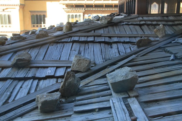This roof is for real. Many homes in Bhutan have these kinds of wood shingles held down by rocks. And it works for them.