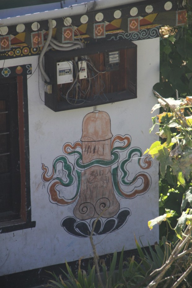Phalluses, complete with semen, are a beloved symbol of fertility. Hence, they’re seen in the countryside and not downtown Thimpu, that is, they can be found on about 90% of Bhutanese houses. In theory. After a while you don’t even see them, but in the beginning, be ready for laughs and smirks of embarrassment, especially if you travel with your young children.