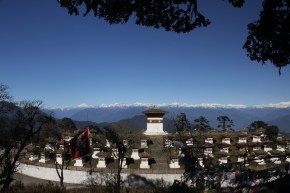 And we walk back down to Dochu la. Dochu la, the name of a pass, is at 3,140 meters. This chorten, made up of 108 smaller stupas, a very auspicious number.