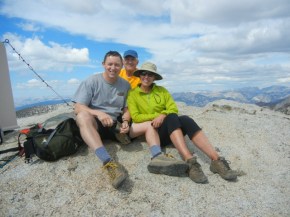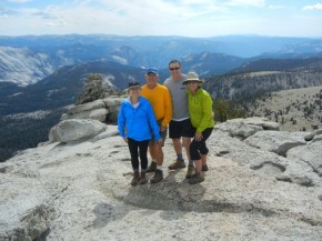 Our only group picture is this one: from the top of Mount Hoffman, with… guess which chopped-off mountain in the distance behind my head?
